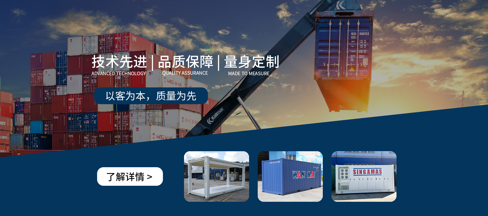公司位于同安工業(yè)集中區(qū),占地150多畝,注冊資本2300萬美元,員工近1000名,擁有五十三多項(xiàng)技術(shù)專利,建有標(biāo)準(zhǔn)箱和定制箱生產(chǎn)線及專用集成車間,單班年產(chǎn)能可達(dá)十五萬標(biāo)準(zhǔn)箱。憑借自身合理完善的運(yùn)營機(jī)制,公司除獲得包括中國船級社在內(nèi)的國際各大船級社的認(rèn)證外,還通過了ISO質(zhì)量管理體系和環(huán)境管理體系認(rèn)證......